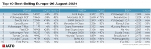 Quanto às vendas somadas de “plug-in” e de elétricos, conseguiram atingir o seu segundo melhor mês de sempre, com uma quota de 21% o que equivaleu a 151 737 unidades vendidas em Agosto de 2021. Uma subida de 61% face a Agosto de 2020.