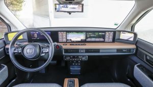 Face a este ambiente propositadamente nostálgico do Mini, o Honda “e” propõe um habitáculo bem mais “tecnológico”. Os três painéis digitais preenchem o tablier de um lado ao outro, mas não têm uma definição espetacular. São um “gadget” curioso para condutor e passageiro da frente. Nos extremos estão os ecrãs dos retrovisores, que usam câmaras exteriores no lugar dos espelhos.