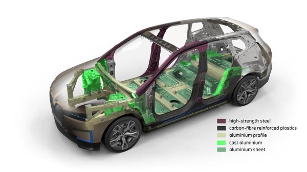 O iX estreia uma nova plataforma para modelos 100% elétricos, feita de painéis de aço estampado, alumínio estampado e fundido e até painéis em fibra de carbono, para os pilares da frente a aros das portas e da tampa elétrica da mala. Onde ficam visíveis.