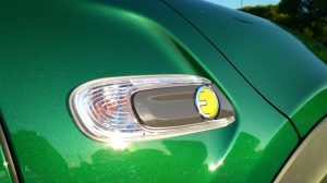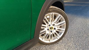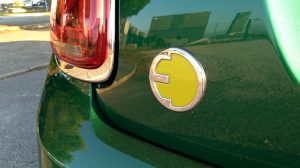 Uma grelha fechada, um símbolo amarelo-limão com a letra “E” e nada mais distingue este Cooper SE de qualquer outro Mini, pintado no verde metalizado comemorativo dos 60 anos do lançamento do primeiro Mini.