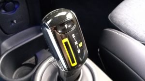 Tem a alavanca da caixa automática e dois botões balanceiros na consola com novas funções: escolha da intensidade de regeneração e dos modos de condução.