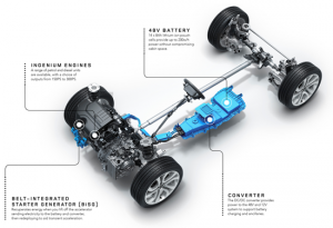 O “mild-hybrid” não dispensa o convencional circuito elétrico de 12V do carro. Existe um transformador DC/DC para o sistema de 48V carregar a bateria de 12V. Outras vantagens é que ocupa pouco espaço e tem pouco peso.